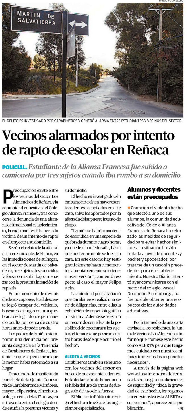 Vecinos alarmados por intento de rapto de Escolar en reñaca