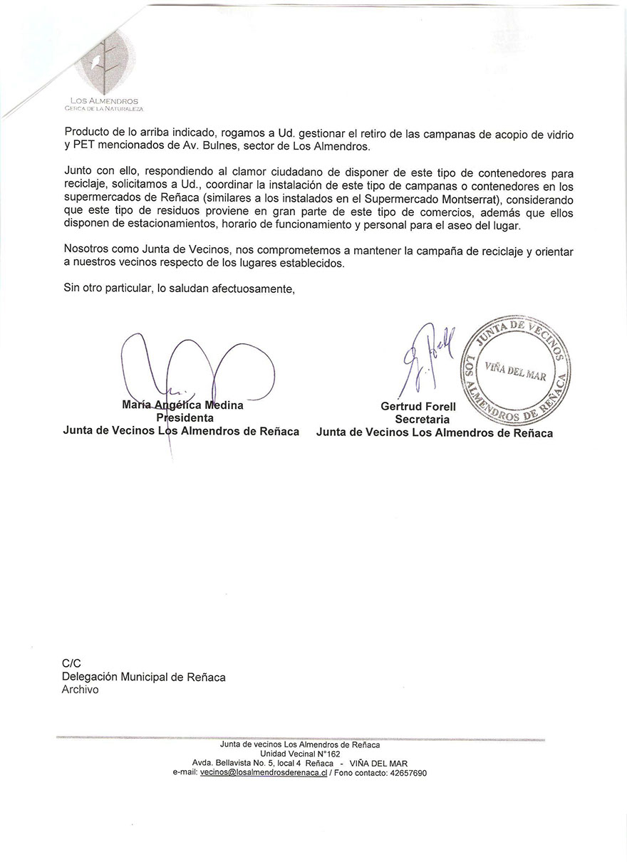 - Enviar copia de queja a la JVLAR, vecinos@losalmendrosderenaca.cl