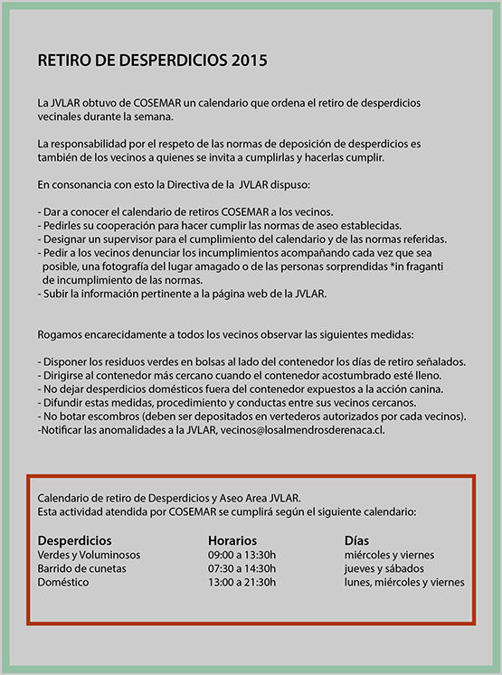 Si observa, de forma reiterativa, que la recolección no se realiza debidamente, llame al teléfono 800 340 303 de Cosemar, identificando la ubicación del contenedor y el tipo de servicio con deficiencia. Por favor, enviar número y tipo de queja al mail vecinos@losalmendrosderenaca.cl, para así poder hacer un seguimiento formal.