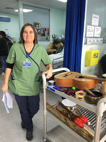 “Desde hace 2 años, trabajo en el Hospital Clínico Universidad de Chile, atendiendo pacientes hospitalizados en distintas unidades (UCI, NEO, Cuidados Paliativos, Neurología, etc.) y ambulatorios. Esta actividad está suspendida desde marzo, producto de la pandemia”. En el área clínica, también trabajo con niños/as y adolescentes en el Centro Pediatría Montemar (Concón-Reñaca), y con adultos en consulta particular. En el ámbito de la prevención, realizo talleres de musicoterapia y desarrollo integral en la primera infancia”.